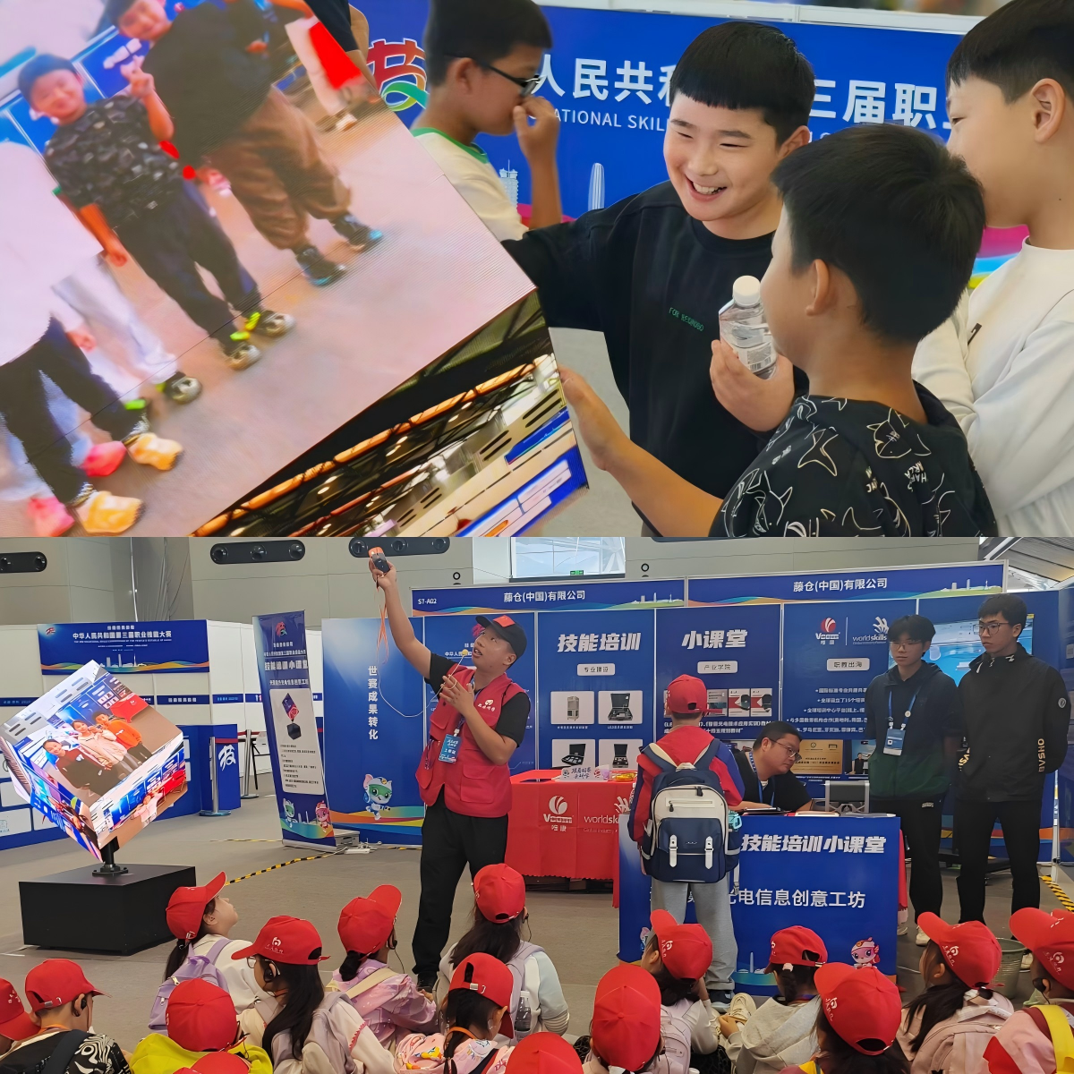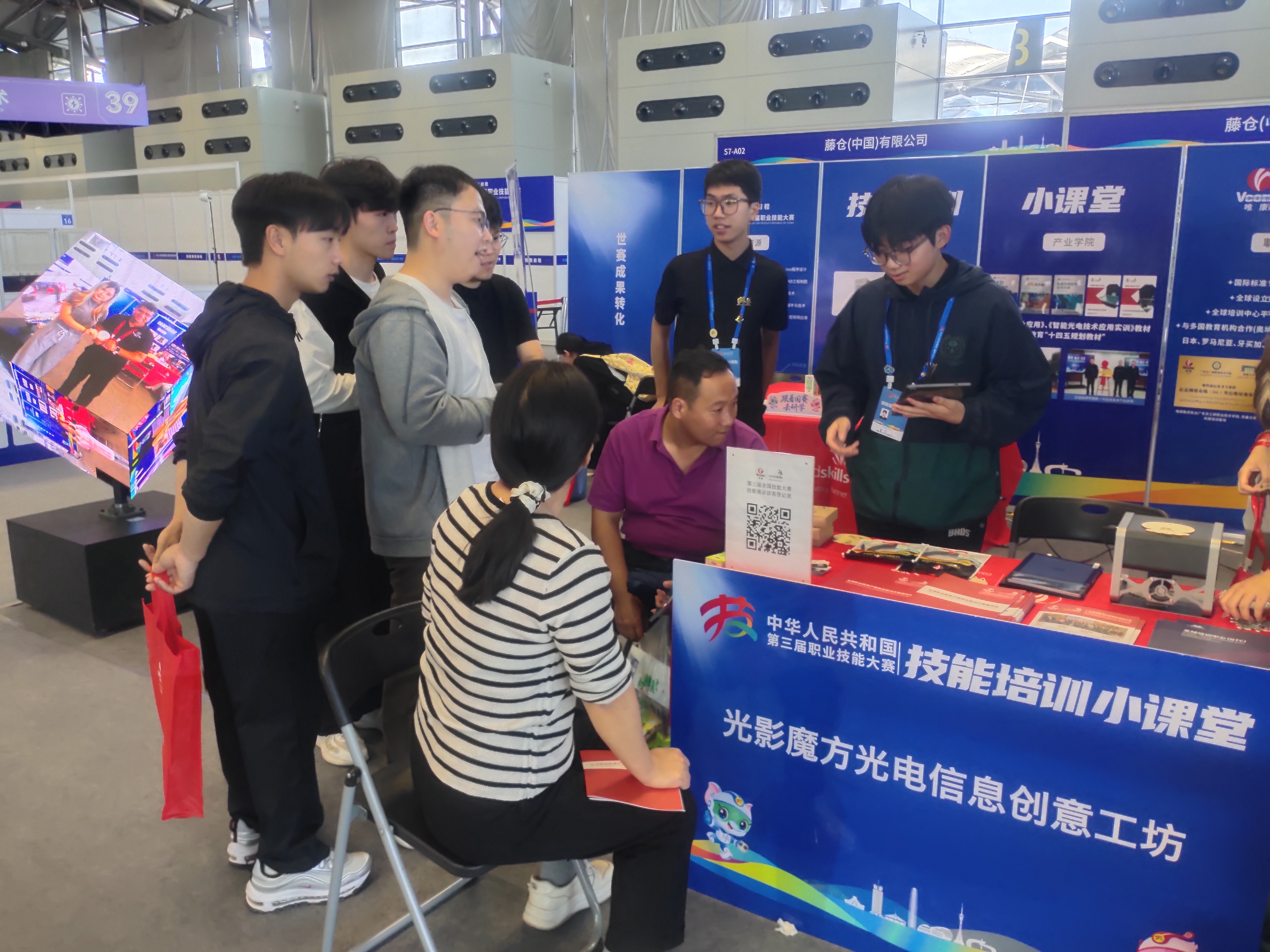 At Booth S7-A01, VCOM launched the “Optoelectronic Information Technology Skills Training Classroom,” designed in line with WorldSkills standards. Through interactive hands-on experiences such as a rotating six-sided LED cube display and laser engraving modules, the booth offered an immersive and engaging approach to skills learning, showcasing the innovation and creativity behind modern vocational skills.