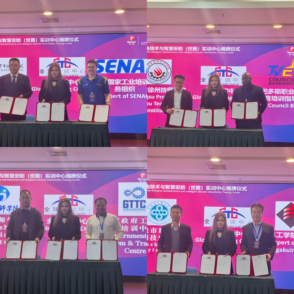 At the same time, the physical implementation of WorldSkills standards became a major pillar of the event. The Optoelectronic Technology and Intelligent Security (WorldSkills) Training Center, jointly established by the Shanghai Employment Promotion Center and VCOM, was officially inaugurated and began operation as the Global Training Center - Shanghai Branch. Built in full alignment with WorldSkills technical and equipment standards, the center comprises five major training areas: Optoelectronic Technology, Intelligent Security Technology, ICT Network Infrastructure (Information Network Cabling), Health and Social Care, and Electronics. It serves not only high-level competitor training and trainer development, but also broader social training and skills qualification programs, functioning as an integrated platform connecting international standards, industrial demand, and skills talent development. During the inauguration ceremony, the GTC signed three-party cooperation intentions with organizations and institutions including SENAI (Brazil), GTTC (India), TVET Council Barbados, Nihon Kogakuin College (Japan), as well as several leading vocational institutions in China, laying a solid foundation for long-term international skills talent cultivation.